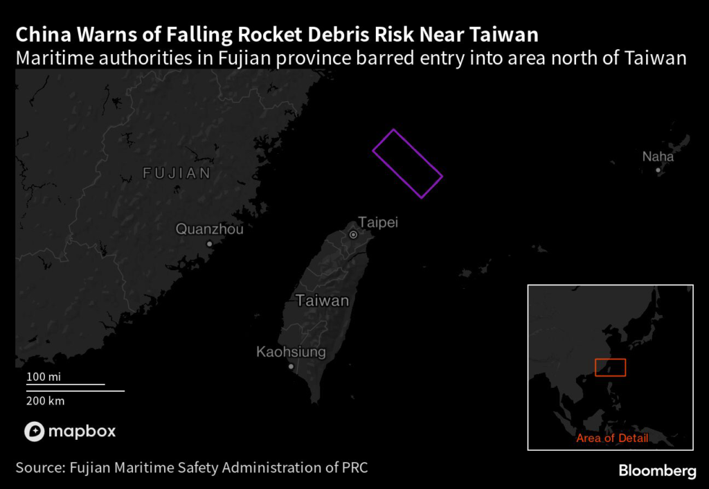 (Bloomberg) — China said it released relevant notices on the risk of falling debris near Taiwan this weekend following a planned satellite launch, denying Taipei’s claims that a no-fly zone will be imposed to the north of the island.
