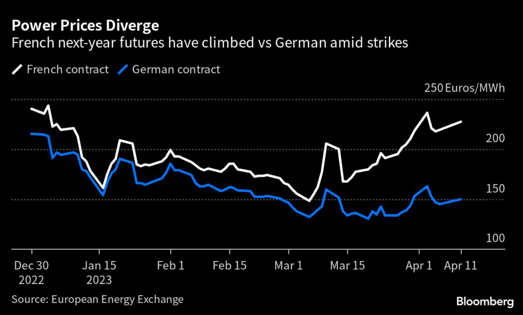 The combined punch of strikes and renewed nuclear concerns has sent French electricity prices soaring.