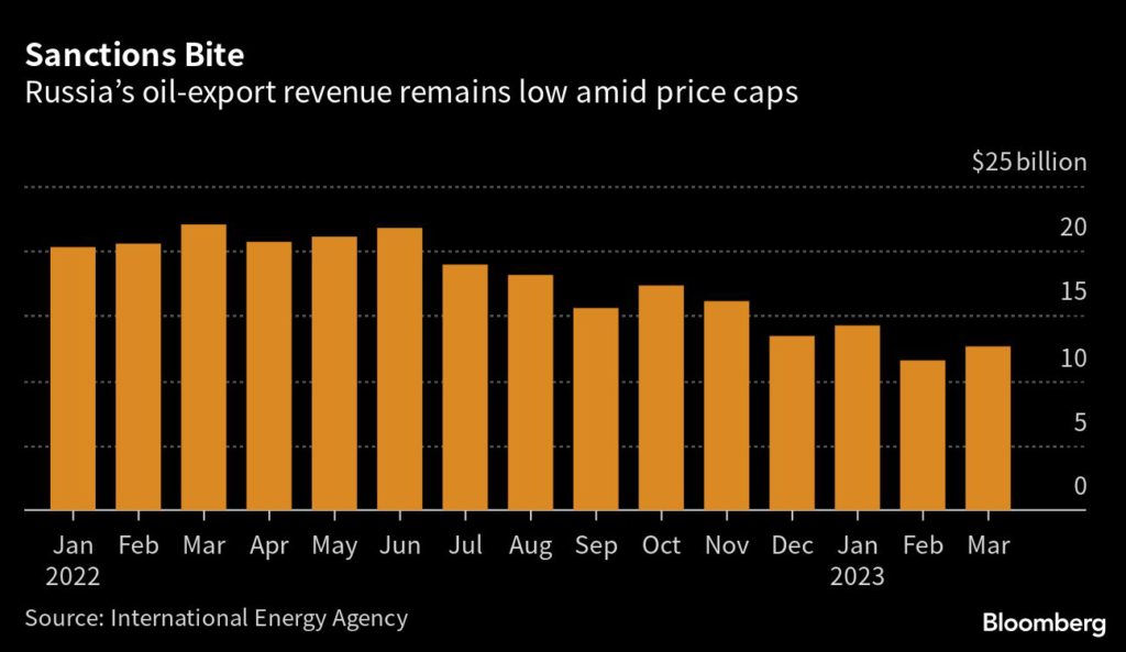 (Bloomberg) — Sanctions on Russia appear to be working as intended, with oil exports in March the highest since Covid yet revenue down by nearly half from a year earlier, data from the International Energy Agency show.