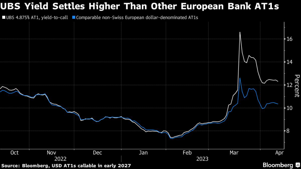 The yield that investors demand until a $1.5 billion bond UBS Group AG bond is callable in early 2027 stands at more than 12%, about 200 basis points above the yield in similar notes from non-Swiss issuers.
