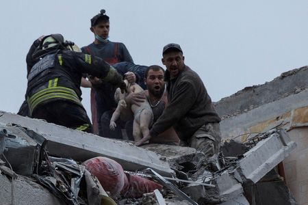 SLOVIANSK, Ukraine (Reuters) – Russian missiles hit residential buildings in the eastern Ukrainian city of Sloviansk on Friday, killing 11 people, wounding 21 and reducing parts of apartment blocks to a tangled mess of metal and concrete.
