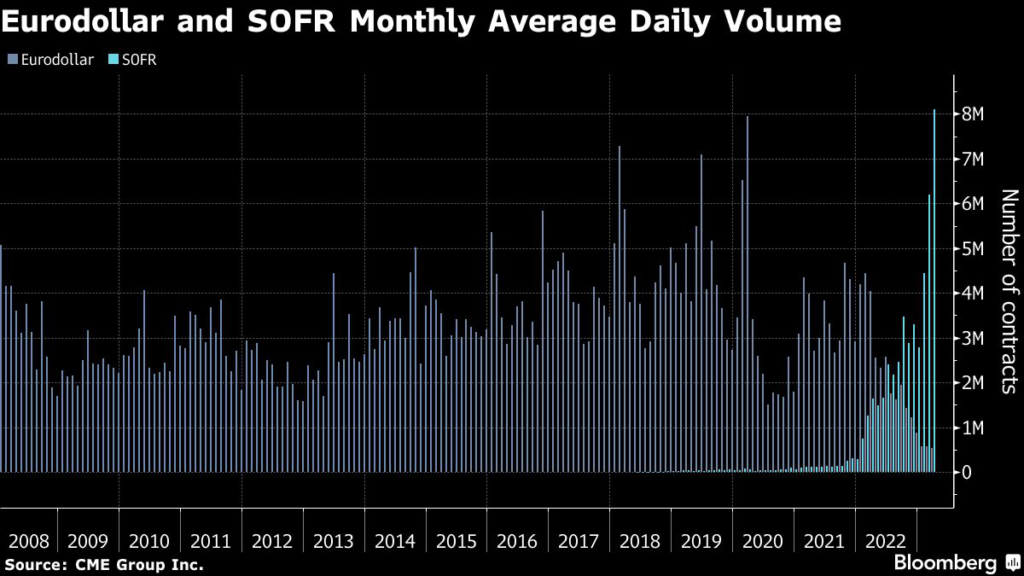 Friday is when CME Group Inc., the exchange operator that lists the contracts, will convert those expiring after June to futures or options on the Secured Overnight Financing Rate, which have overtaken eurodollars in trading volume.