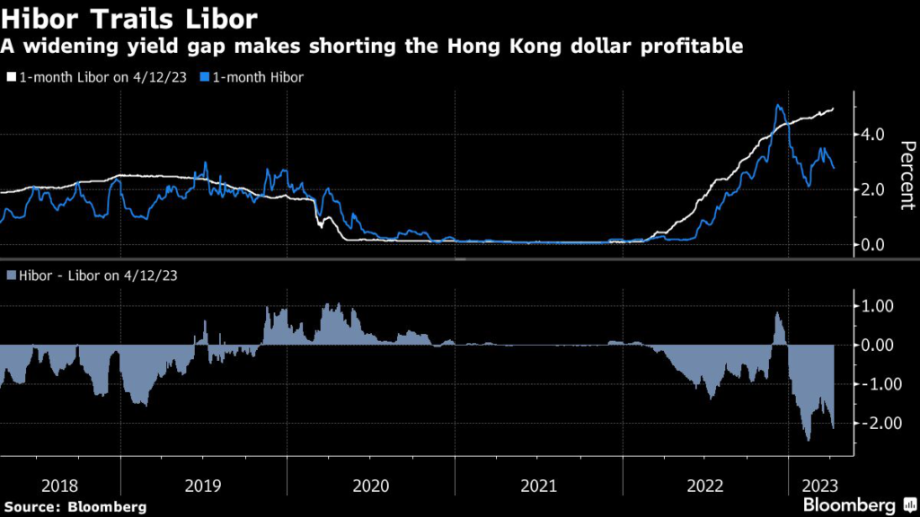 That’s because the short Hong Kong dollar trade is getting more profitable as Hibor falls, while comparable dollar rates rise. The city’s currency has been repeatedly pushed to the weak end of its trading band, prompting its de facto central bank to buy local dollars.