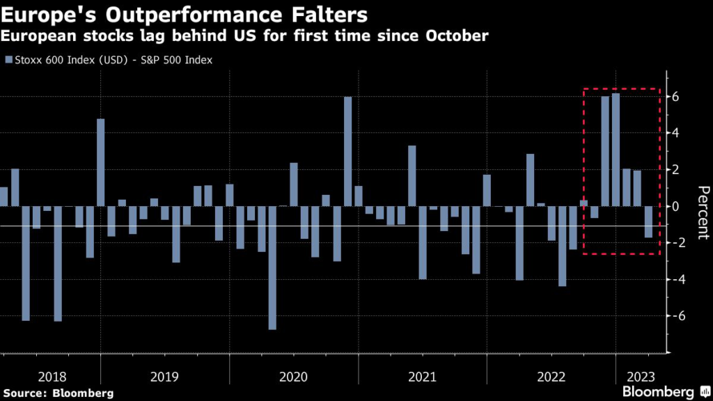 No wonder then that returns on Europe’s Stoxx 600 lagged the S&P 500 in March for the first time since October.