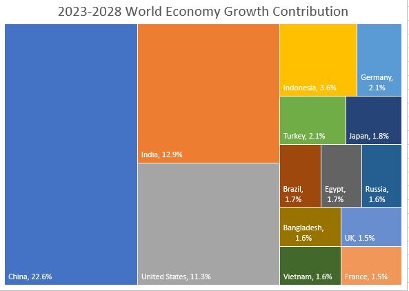 The nation’s slice of global gross domestic product expansion is expected to represent 22.6% of total world growth through 2028, according to Bloomberg calculations using data the fund released in its World Economic Outlook released last week.