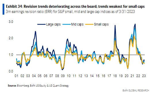 Still, BofA forecasts downward guidance from companies, noting that earnings revisions have been deteriorating across the board.