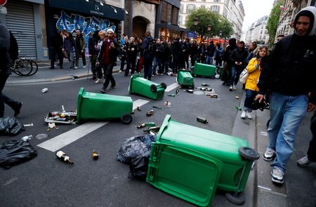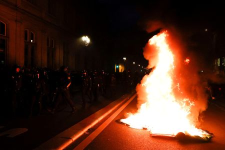 As Macron started his speech, demonstrators banged pots and pans in front of town halls across the country and small groups of protesters set garbage bins on fire in Paris.