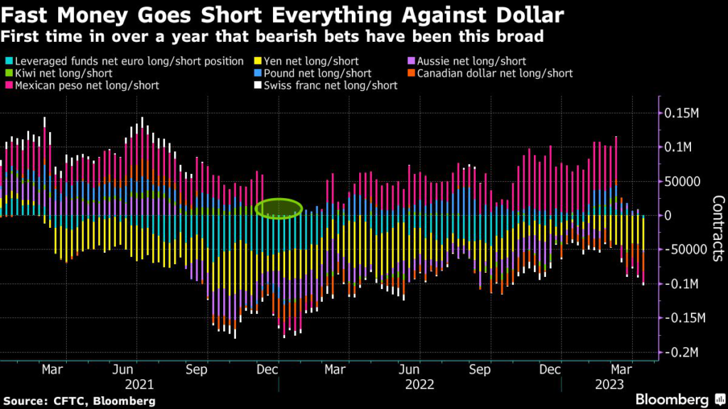 Leveraged funds were net short all major currencies against the dollar last week, the first time that’s occurred since January 2022, according to the latest Commodity Futures Trading Commission data.