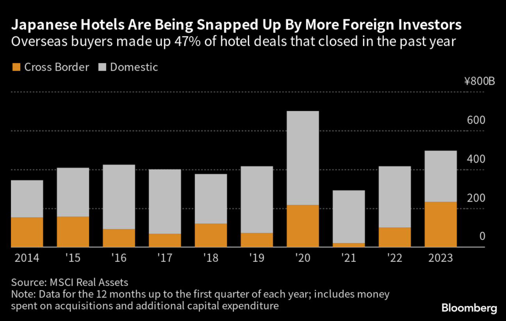 Overseas buyers were responsible for 47% of the 494.3 billion yen ($3.7 billion) invested in hotel deals that closed in the past 12 months — the highest proportion since 2014, according to data at the end of March from research firm MSCI Real Assets.