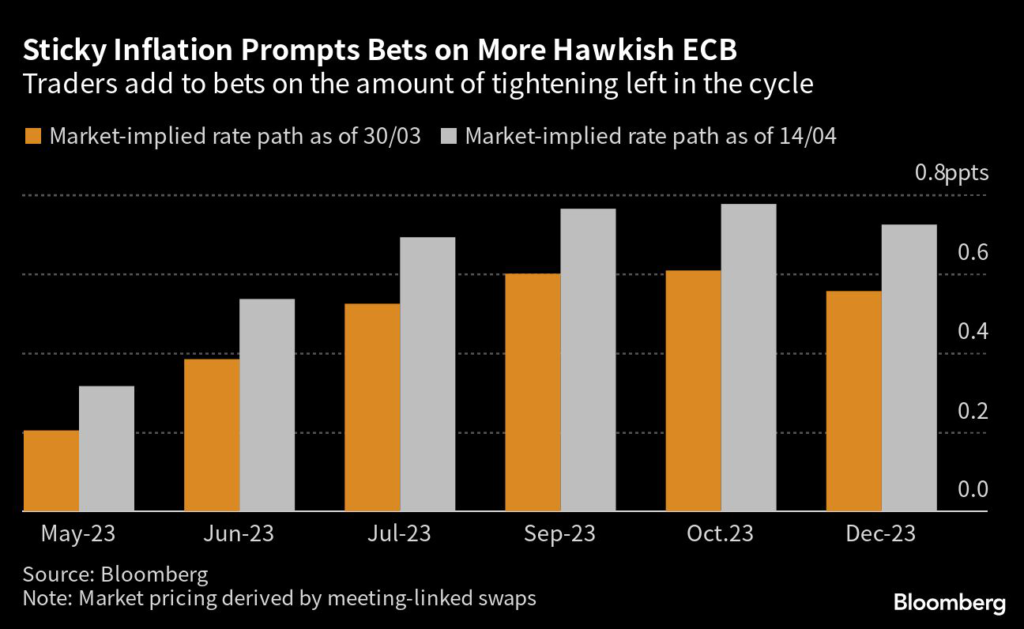Traders ratcheted up bets that the ECB will extend its hiking cycle through September after Governing Council member Robert Holzmann warned stubbornly high inflation warrants a 50 basis-point increase in interest rates in May.