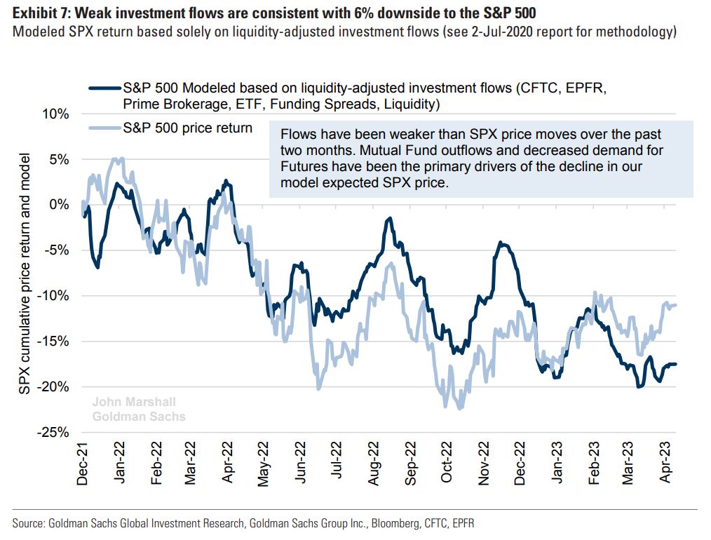 Mutual fund and futures-market outflows suggest that rather than rise, the index should have been down 3% over the past three months, according to a model kept by Goldman Sachs Group Inc.