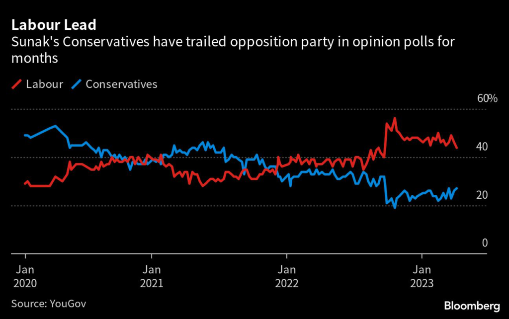 Sunak’s Conservative party is currently trailing the opposition Labour party by a double-digit margin in national opinion surveys.