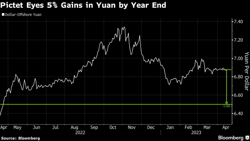 (Bloomberg) — The yuan may rally 5.5% against the dollar this year as the Chinese economy strengthens and the US pulls back from rate hikes, according to Swiss asset manager Pictet Asset Management SA.