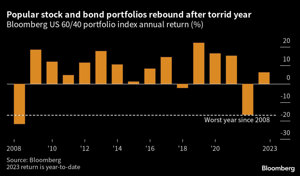 A Bloomberg US 60/40 portfolio index is up 6.3% this year after tumbling almost 17% in 2022 in its biggest annual drop in over a decade.
