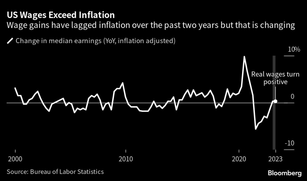 (Bloomberg) — US workers are starting to see pay gains run faster than inflation, amplifying their purchasing power and giving the Federal Reserve reason to raise interest rates again next month.