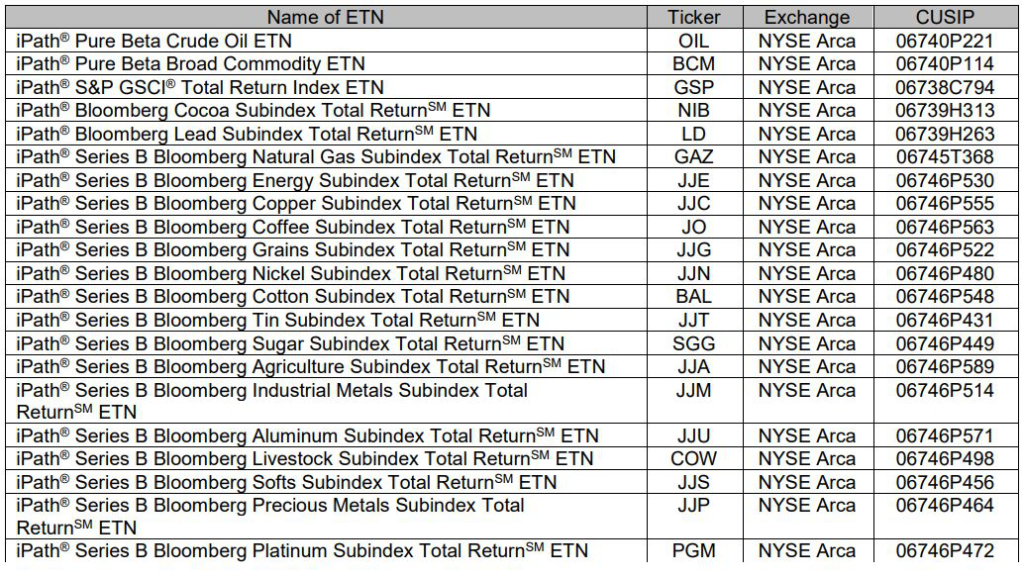 The $71 million iPath Series B Bloomberg Copper Subindex Total Return ETN (ticker JJC) is the largest of the notes being closed, which hold around $533 million assets in total.
