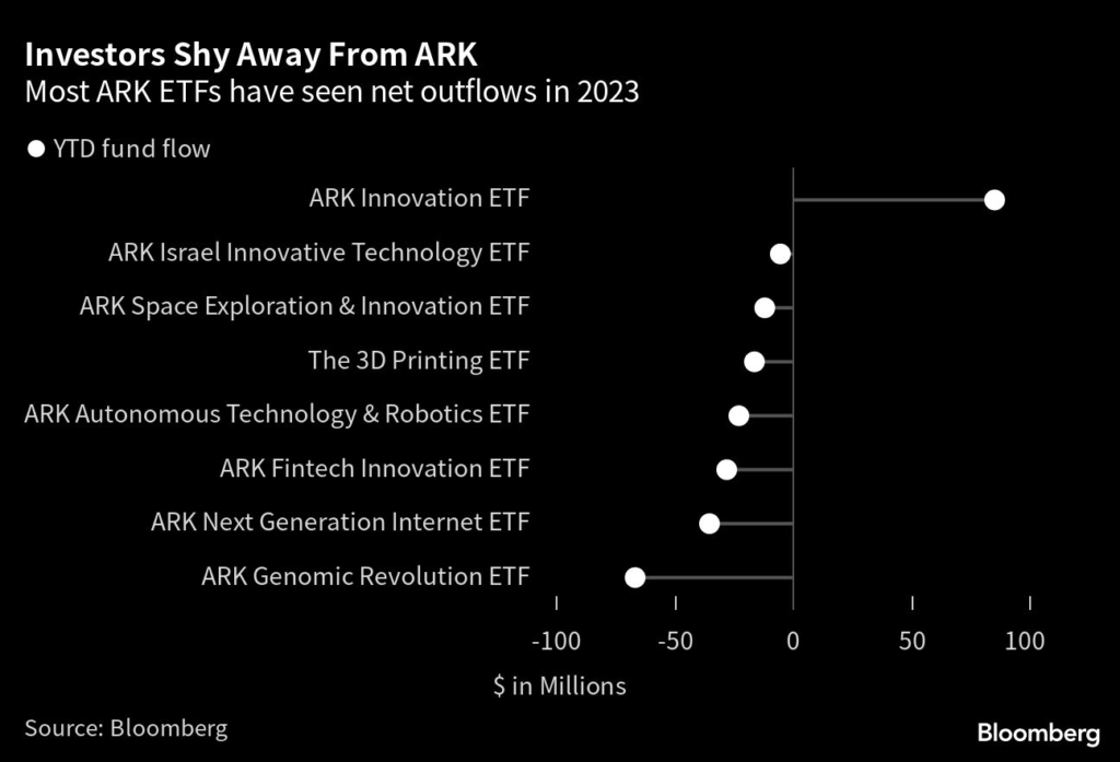 All but one US-listed ARK exchange-traded fund, the flagship ARK Innovation Fund (ticker ARKK), have seen outflows in 2023, despite the fact that most funds have at least matched — and in some cases trounced — the performance of the S&P 500 Index, according to data compiled by Bloomberg.