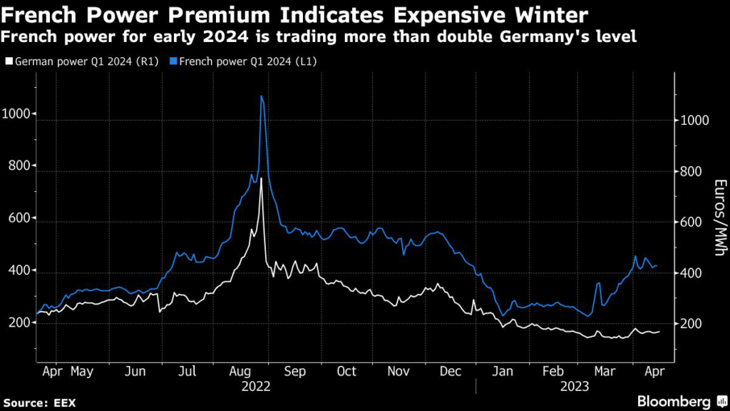 French power for the first quarter of 2024 is trading at €416 per megawatt-hour, more than double Germany’s rate of €169.