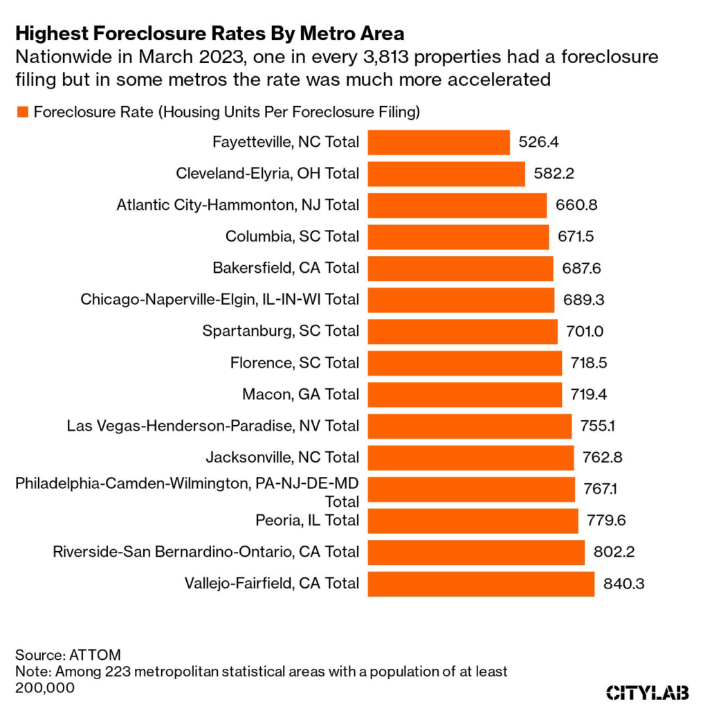 Major metro areas with the highest foreclosure rates in the January-March period included Fayetteville, North Carolina (one in every 526 housing units); Cleveland (one in 582); Atlantic City, New Jersey (one in 661); Columbia, South Carolina (one in 671); and Bakersfield, California (one in 688).