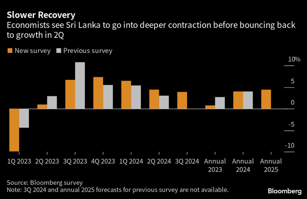Economists sharply cut Sri Lanka’s growth outlook through this year as curbs on imports and still-limited reserves persist even as the International Monetary Fund releases bailout loans and authorities work toward debt restructuring efforts.