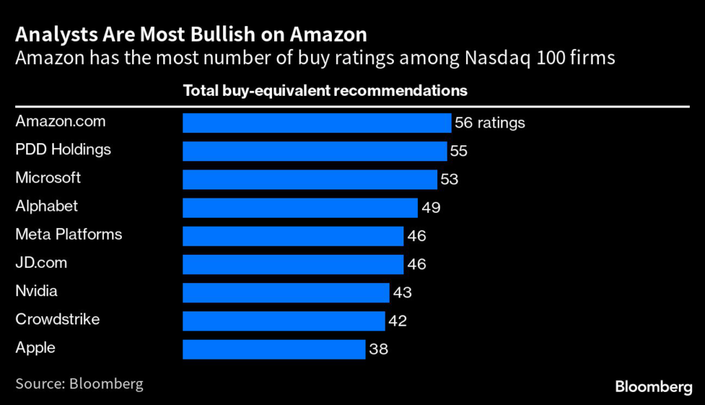 has 56 buy or equivalent ratings from analysts, the most among Nasdaq 100 companies, according to data compiled by Bloomberg. The list also features fellow technology megacaps like Microsoft Corp., Alphabet Inc.