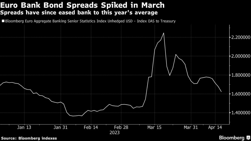 Spreads on European lenders’ senior bank bonds surged past 220 basis points, but have since eased back to about 164, which is in-line with the average so far this year, a Bloomberg index shows.