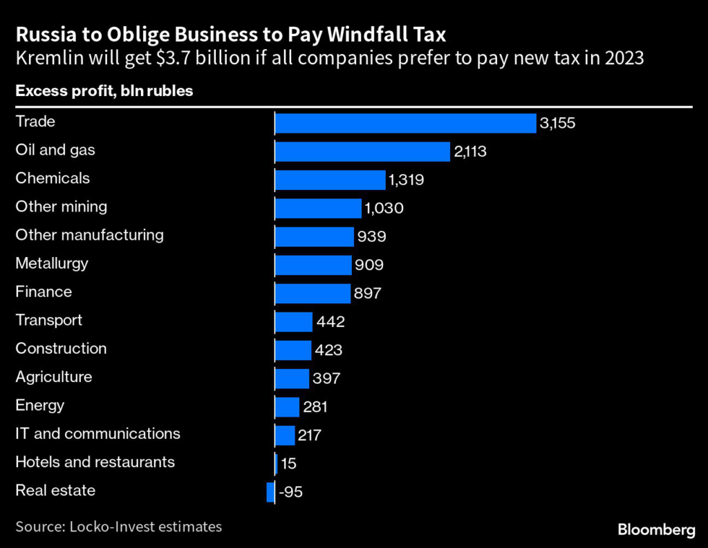 With the exception of the oil, gas and coal industries, the windfall tax now aims to claw back an extra 300 billion rubles ($3.7 billion) by charging 10% on excess profits earned in 2021-2022 compared with the prior two years.