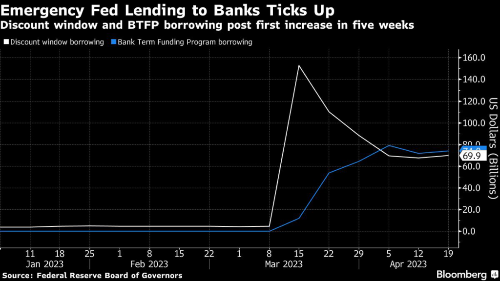 (Bloomberg) — Banks increased emergency borrowings from the Federal Reserve for the first time in five weeks, indicating that financial stresses are lingering after a string of bank collapses last month.
