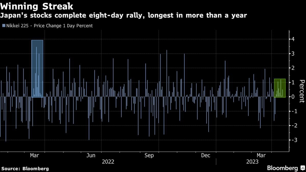 (Bloomberg) — Japanese stocks are enjoying their longest winning streak in more than a year as Warren Buffett’s renewed interest in the nation’s equity market bolsters sentiment.