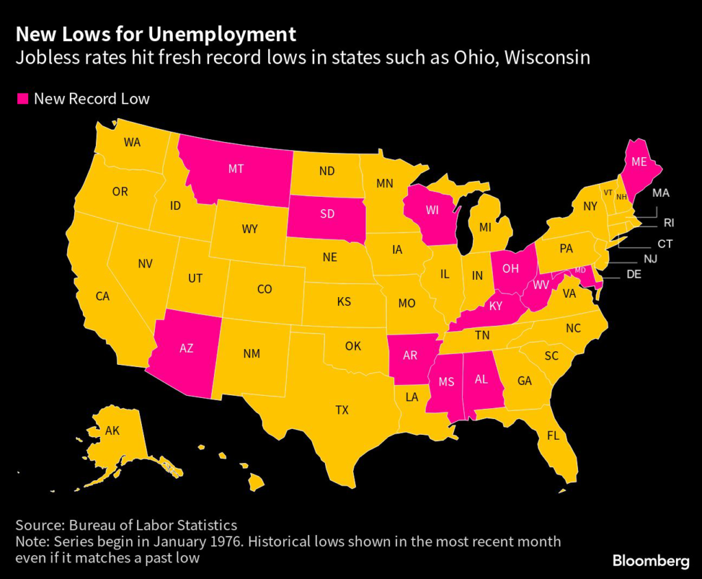 (Bloomberg) — A dozen US states saw their unemployment rates fall to a record low last month, according to new data from the Bureau of Labor Statistics.