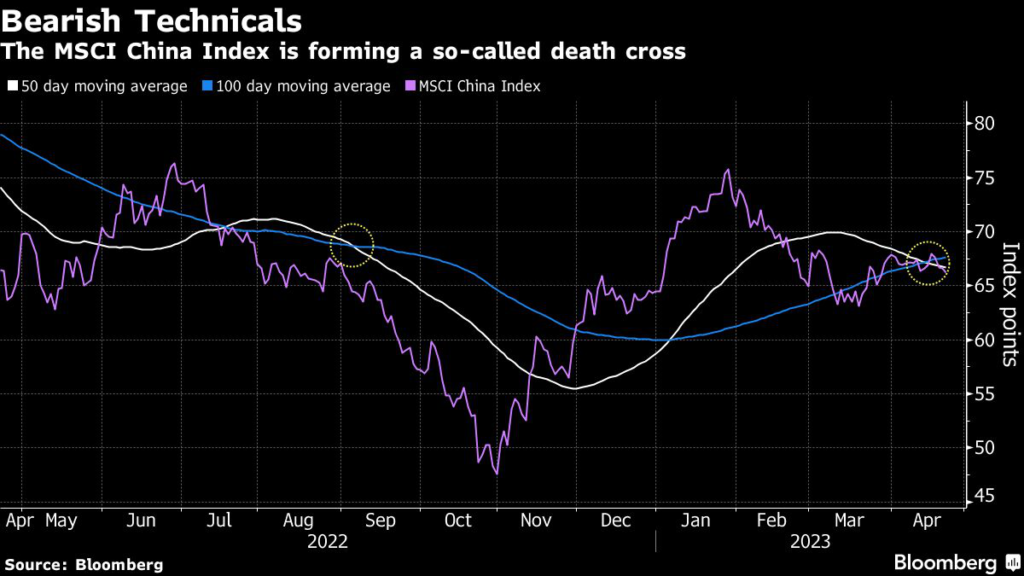 A death cross — where a short-term moving average crosses below a longer-term equivalent — has recently appeared on the MSCI China Index.