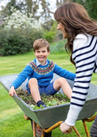 In one, he is seen being pushed in a wheelbarrow by his mother, while the second is a close-up of a smiling Louis looking off to the side of the camera.