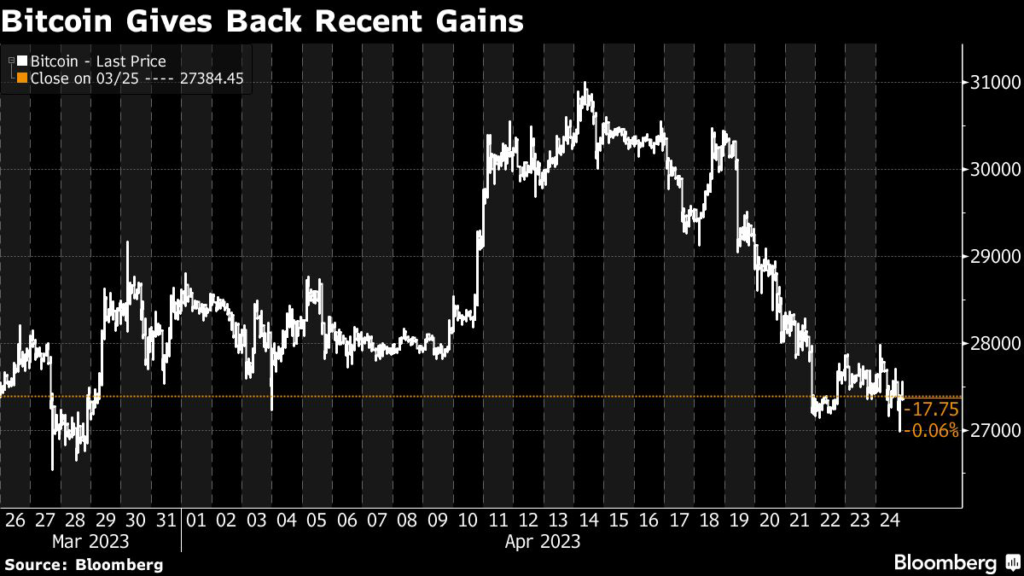 That was the first time the price was below $27,000 since March 28. Other digital assets were mostly flat to higher, with Ether little changed and Avalanche up about 2%.