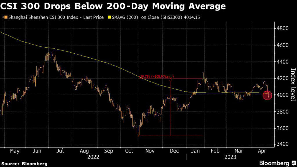 “The CSI 300 has now breached below its key 200-day moving average reinforcing the ongoing profit-taking activities” due to a lack of further liquidity support from the central bank, said Kelvin Wong, senior market analyst at Oanda Asia Pacific Pte.