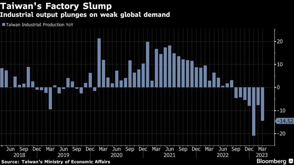 (Bloomberg) — Taiwan’s industrial production plunged in March, weighed down by a manufacturing sector struggling to overcome a slump in global demand.
