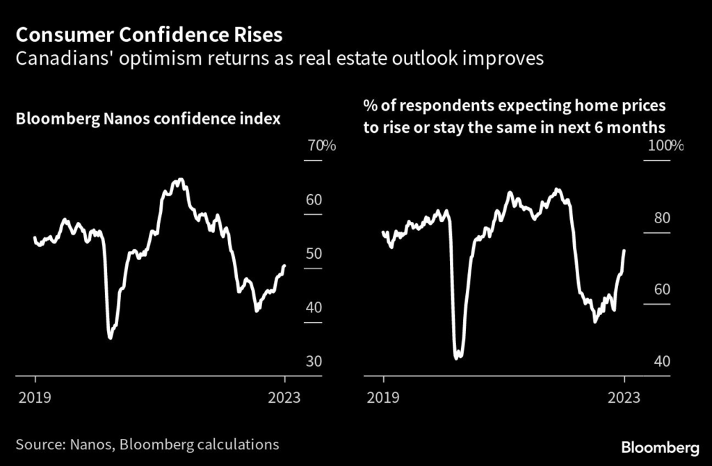 (Bloomberg) — Canadians are growing more optimistic as the outlook for real estate steadily improves and the economy grinds ahead with few signs of an imminent recession.