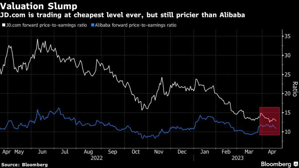 The pessimism is reflected in a valuation that at 12.6 times forward one-year earnings is the cheapest ever, although the stock is still pricier than China’s e-commerce bellwether Alibaba Group Holding Ltd.