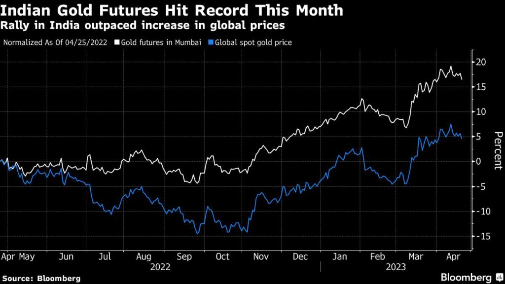 Global gold prices have surged this year as turmoil in the banking industry spurred demand for a haven, helping send futures in India to a record in April.