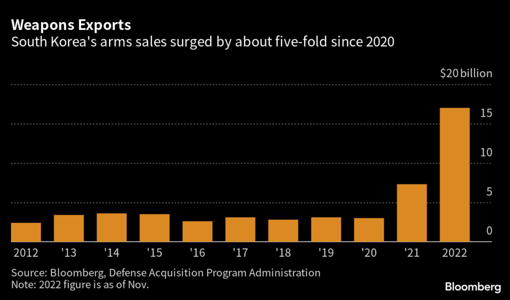 While Seoul may not be officially sending arms to Ukraine, Russia’s war has opened a door for South Korea’s defense exports, which were on track to more than double in 2022 as buyers including countries in Europe seek to replace Soviet-era weaponry with higher tech arms.