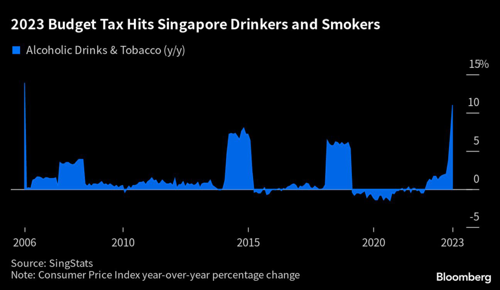 The cost of cigarettes and alcoholic beverages in the city-state increased 11% from a year earlier in March, according to the latest inflation data from the Singapore Department of Statistics. That follows a 15% increase in excise duty for all tobacco products in the local government’s budget for 2023, a move expected to generate $100 million in additional revenue per year.
