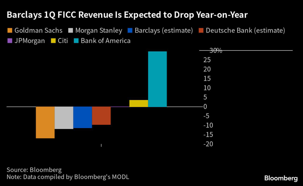 Estimates compiled by Bloomberg expect revenue from fixed-income, currency and commodities trading to fall 11.4% to £1.5 billion ($1.9 billion), while equities trading revenue is seen down 17.9%.