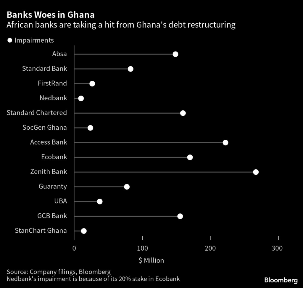 Banks operating in West Africa’s second-largest economy have taken a hit of about $1.4 billion, according to Bloomberg calculations, as Ghana restructures most of its public debt, estimated at 576 billion cedis.