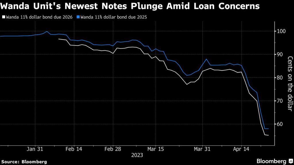 Two dollar bonds issued by a Dalian Wanda unit early this year now trade below 60 cents, according to Bloomberg-compiled prices, levels typically considered distressed.