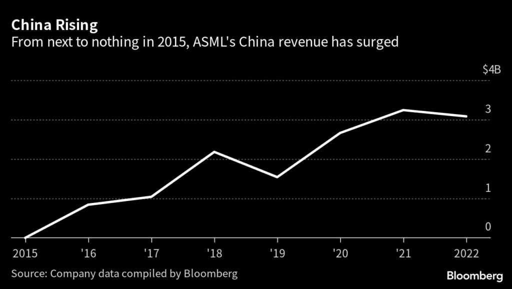 The Asian giant, which a decade ago was a rounding error for ASML, was its third-biggest market behind Taiwan and South Korea in 2022, accounting for about 15% of revenue.