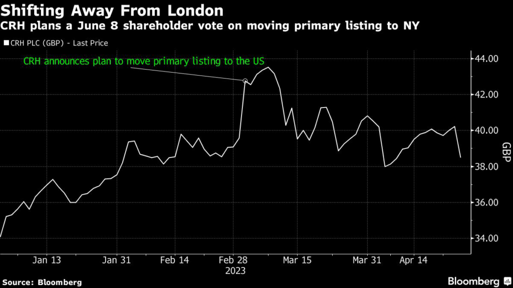 (Bloomberg) — Irish building-materials company CRH Plc will ask shareholders to vote in June on moving its primary stock-market listing to the US from London.
