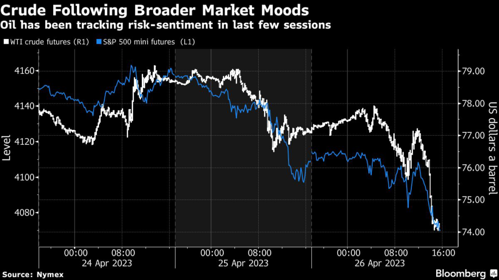(Bloomberg) — Oil, whipsawed by volatile equity markets, fell the most since mid-March when a banking crisis battered the commodity, nullifying gains from a surprise production cut by OPEC+.