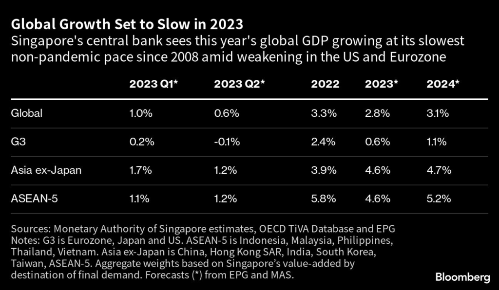 (Bloomberg) — Singapore’s economic outlook has turned more uncertain, as tighter financial conditions weigh on global demand and China’s reopening is doing little more than boosting tourism, according to its central bank.
