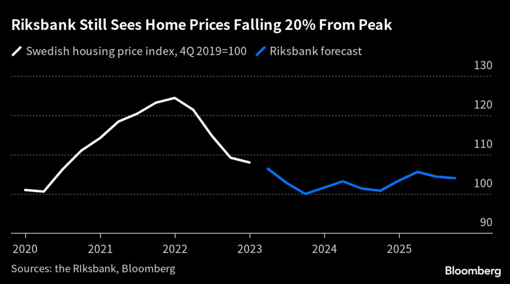 Sweden’s housing market rout still has some way to go according to projections by the central bank, after a year of declines wiped out 15% of home values in the biggest Nordic economy.