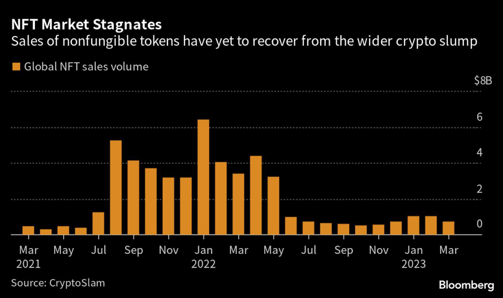Global NFT sales were $736 million in March, according to data from CryptoSlam as of Wednesday, down 29% from the start of this year and marking a fall of 89% from the sector’s $6.4 billion sales peak in January 2022.