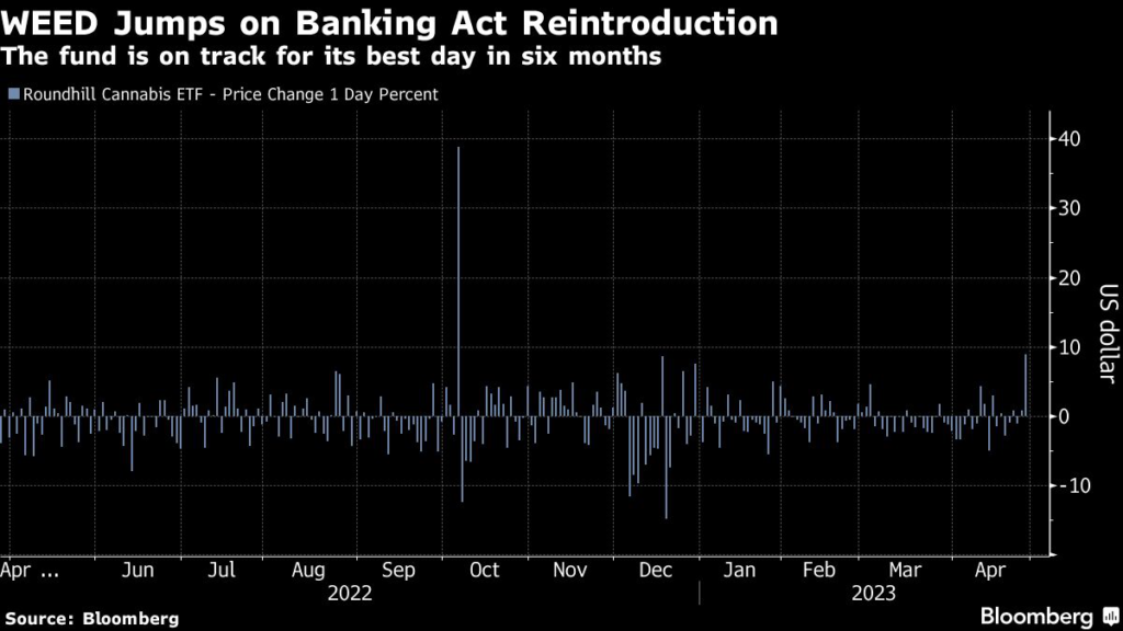 (Bloomberg) — Weed stocks surged after a key piece of legislation was reintroduced in Congress that would open up banking services to the legal cannabis industry.